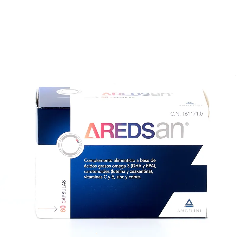 Angelini AredSan es un complemento alimenticio en cápsulas que combina ácidos grasos omega-3, carotenoides, vitaminas y minerales. Está formulado para contribuir al mantenimiento normal de la visión y al funcionamiento antioxidante de las células oculares, especialmente en personas con necesidades específicas de nutrientes vinculados a la salud visual.