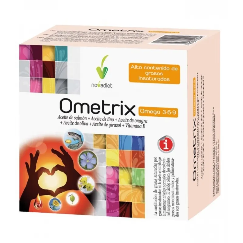 Novadiet Ometrix Omega 3 6 9 es un complemento alimenticio que combina aceites de salmón, onagra, lino y oliva con vitamina E, todo ello en 60 cápsulas de fácil ingesta. Su formulación aporta ácidos grasos esenciales que, según la legislación europea, contribuyen a funciones fisiológicas específicas. Este producto está pensado para complementar la dieta habitual de quienes desean un aporte adicional de nutrientes que, en combinación con un estilo de vida saludable, ayudan a mantener el bienestar cardiovascular y ofrecen protección antioxidante.