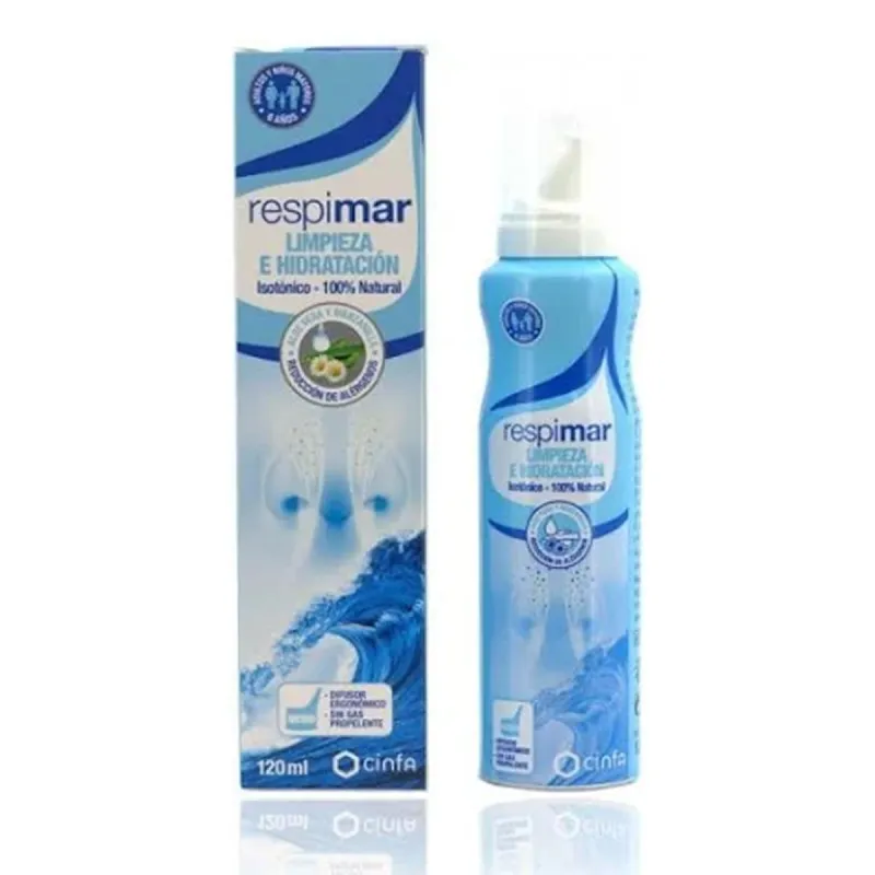 Respimar Limpieza e Hidratación se presenta en un envase de 120 ml con un sistema de pulverización que facilita su aplicación. El envase está diseñado para garantizar la integridad del producto y su fácil manejo, permitiendo una aplicación cómoda y precisa.