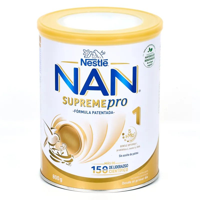Nan Supreme Pro 1 es una fórmula infantil en polvo adaptada para la alimentación del lactante desde el primer día cuando la lactancia materna no es posible. Contiene una mezcla de proteínas parcialmente hidrolizadas, ácidos grasos esenciales y oligosacáridos idénticos a los de la leche materna, junto con vitaminas y minerales para cubrir las necesidades nutricionales del bebé hasta los seis meses.