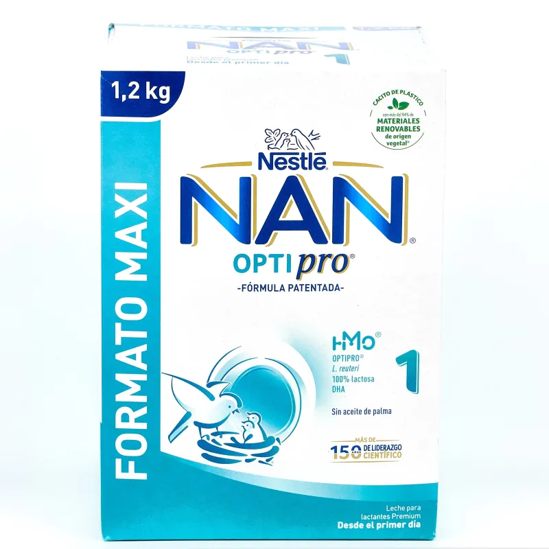 NAN Optipro 1 es una fórmula láctea en polvo recomendada para la alimentación de lactantes desde el nacimiento hasta los 6 meses cuando la lactancia materna es insuficiente o no puede llevarse a cabo. Contiene proteínas OPTIPRO® de elevada calidad, microminerales específicos como zinc y selenio, y una matriz de prebióticos (GOS/FOS) que apoyan la nutrición infantil conforme a las recomendaciones pediátricas y reglamentarias.