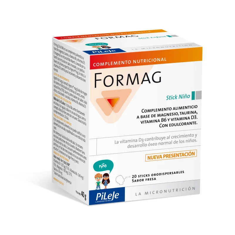 Pileje Formag Stick Niño es un complemento alimenticio pensado para cubrir las necesidades de niños de 3 a 12 años, aportando nutrientes esenciales para el desarrollo del sistema nervioso y el crecimiento de la masa ósea en un formato práctico y de fácil ingestión.