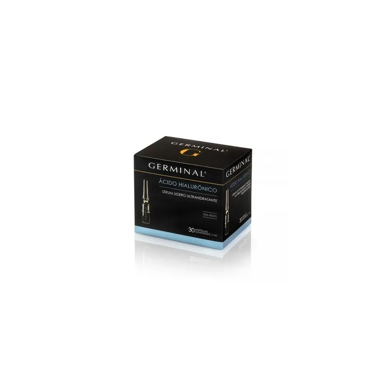 Germinal Acción Profunda Ácido Hialurónico se presenta en un envase que contiene 30 ampollas con 1 ml cada una.