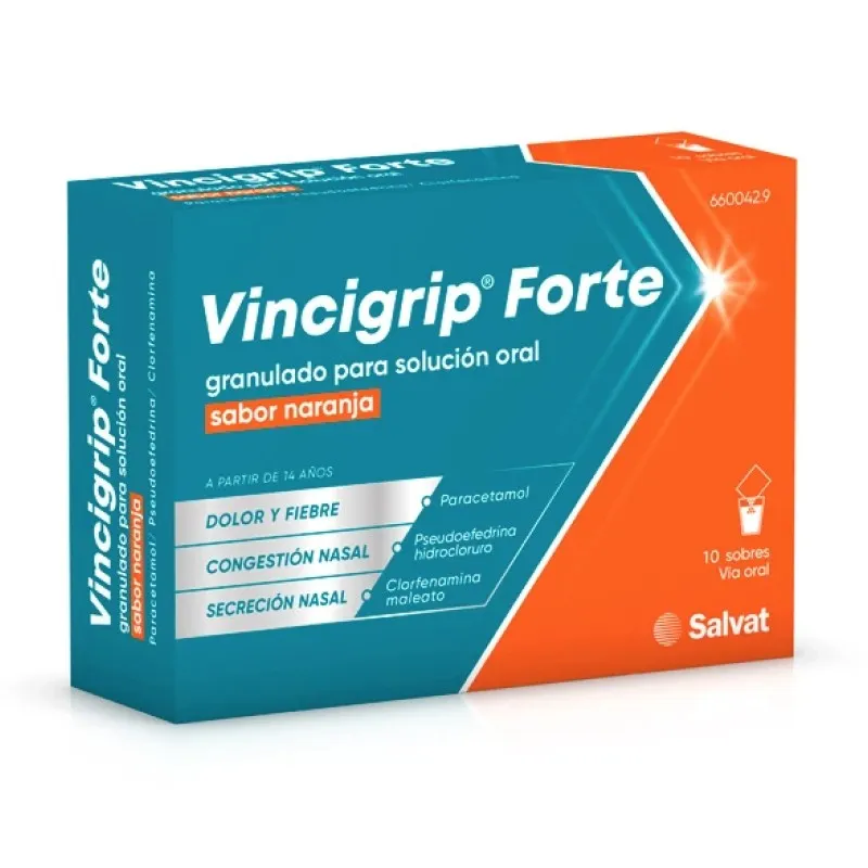 Vincigrip Forte se presenta en sobres conteniendo granulado para solución oral con sabor a naranja.