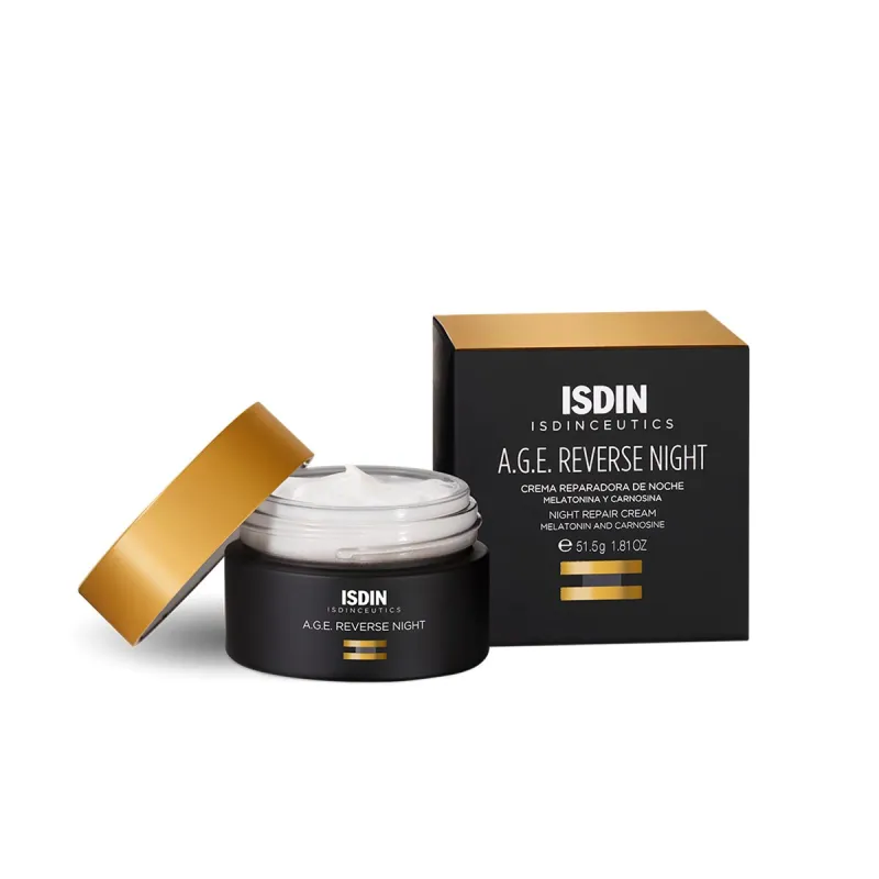 Isdinceutics A.G.E. Reverse Night es una crema antienvejecimiento avanzada de uso nocturno diseñada por los Laboratorios Isdin. Esta crema ofrece una triple acción antienvejecimiento que incluye remodelación del óvalo facial, efecto antiglicación y efecto antipolución. Su fórmula innovadora y científicamente probada ayuda a combatir los signos del envejecimiento, como arrugas y pérdida de firmeza, mientras nutre y regenera la piel durante la noche.