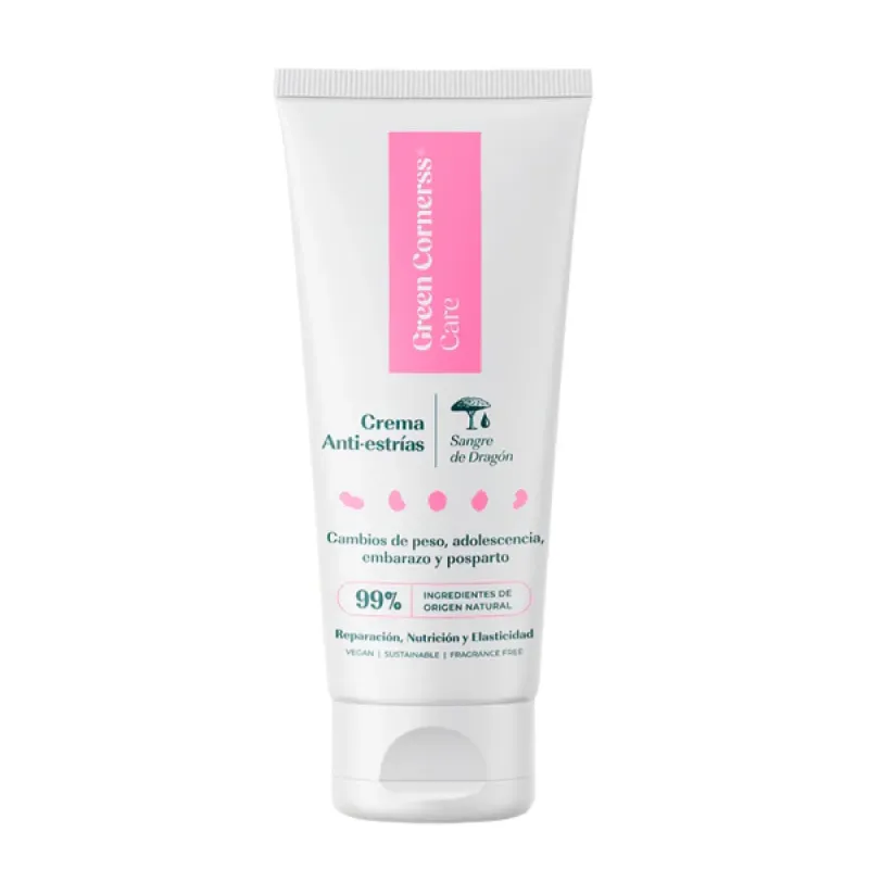 Green Cornerss Crema Anti-estrías de Sangre de Dragón es una crema corporal de 200 ml con un alto porcentaje de ingredientes de origen natural diseñada para apoyar el cuidado de la piel con estrías de distensión. Combina una selección de activos innovadores, entre ellos sangre de dragón extraída de la resina del árbol Croton lechleri, junto a extractos vegetales y aceites nutritivos que trabajan de forma sinérgica para aportar elasticidad, reparación, hidratación y nutrición cutánea. Su textura ligera se extiende fácilmente y se absorbe con rapidez sin dejar sensación grasienta.