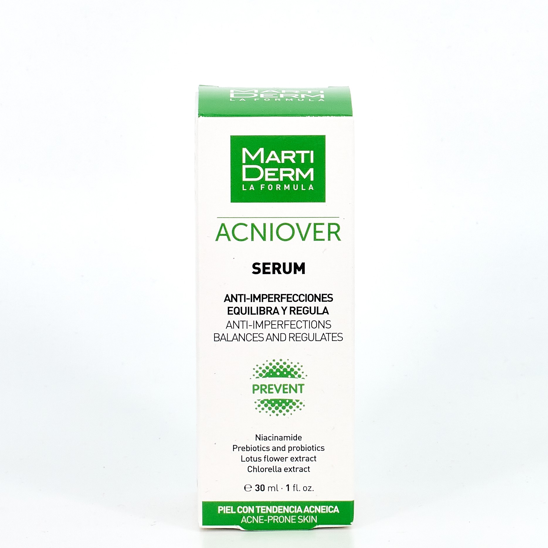 Nuevo Serum anti-imperfecciones Martiderm Acniover combate el acné. Combina pre y probioticos, flor de loto y niacinamida. Regula el ph y la secreción de sebo, efecto matificante.