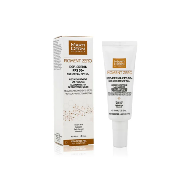 Martiderm crema DSP, está formulada con una combinación de ácidos de eficaz acción despigmentante (Elágico, Kojico, Salicílico) además de Vitamina C y Lactokine. Además su exclusiva fórmula se completa con la incorporación de filtros solares FPS 50 pantalla total de gran eficacia y que lo convierten en una opción perfecta como tratamiento intensivo durante el verano.