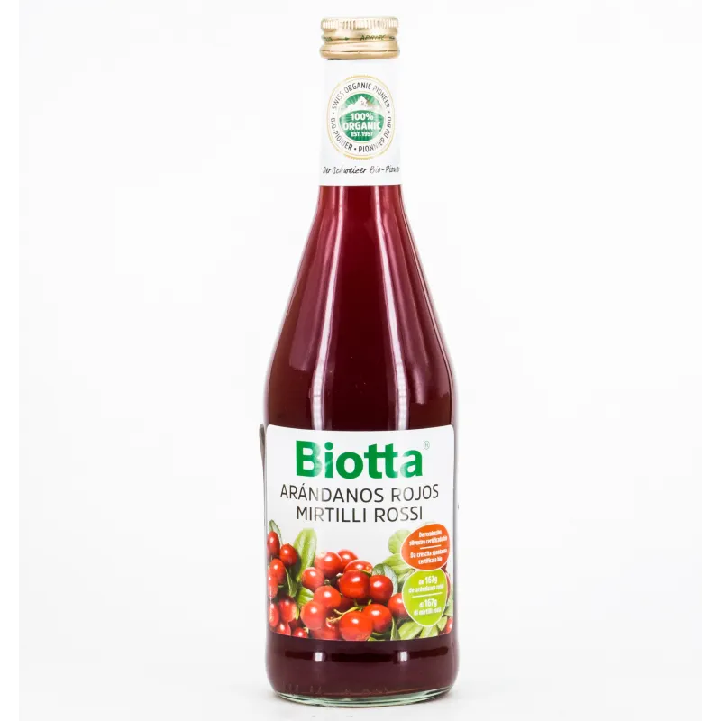 A. Vogel Biotta Arándanos Rojos es un complemento alimenticio a base de jugo concentrado de arándano rojo (cranberry) procedente de cultivos biológicos. Su formulación aprovecha los componentes naturales del fruto, como las proantocianidinas y los polifenoles, conocidos por su actividad antioxidante. La composición del producto contribuye al mantenimiento de la función urinaria normal y al bienestar general, complementando la ingesta diaria de líquidos y nutrientes en adultos.