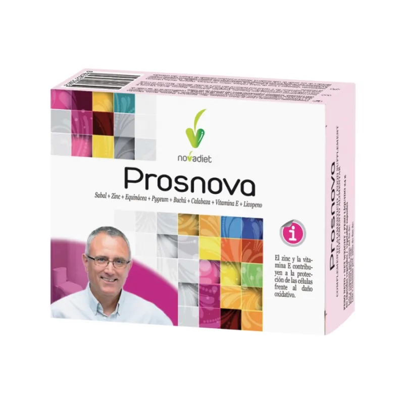Novadiet Prosnova es un complemento alimenticio formulado con ingredientes de origen natural. Su composición está diseñada para mantener el aporte de micronutrientes que ayudan a conservar el bienestar de la zona prostática y a apoyar las funciones fisiológicas normales relacionadas con el sistema urogenital masculino.