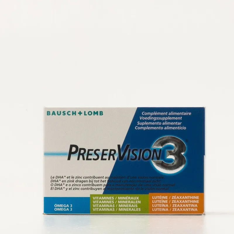 PreserVision 3 es un complemento alimenticio que aporta luteína, ácidos grasos omega-3, vitaminas C y E, y zinc para contribuir al mantenimiento de la visión.
