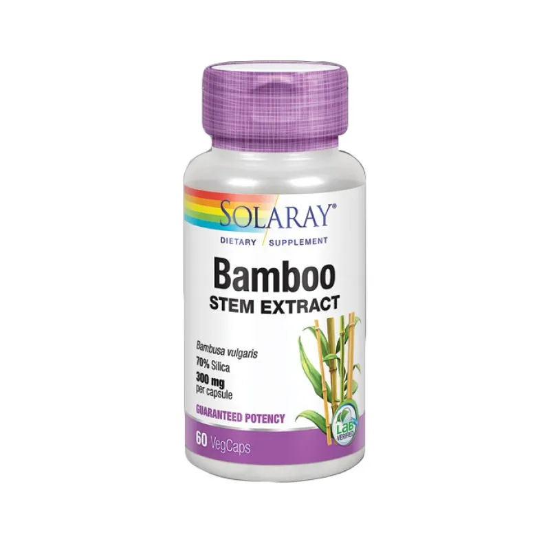 Solaray Bamboo es un complemento alimenticio en cápsulas vegetales que aporta 300 mg de extracto de bambú en cada dosis. Su formulación está diseñada para complementar la ingesta de sílice orgánico, un oligoelemento que interviene en el mantenimiento de tejidos conectivos, huesos, uñas y cabello cuando la alimentación diaria no cubre las cantidades recomendadas.