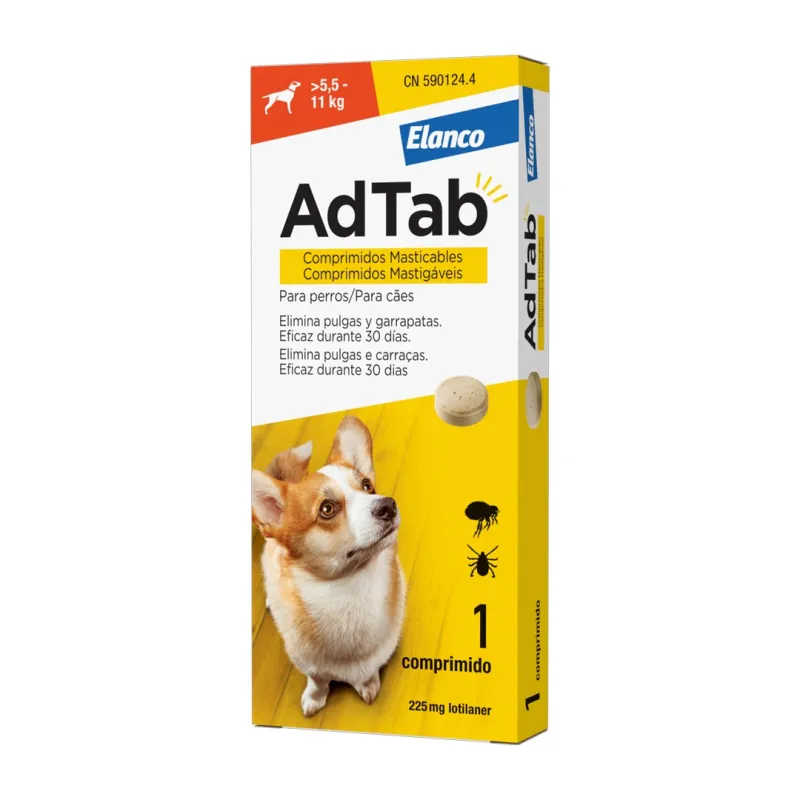 Adtab 225mg ayuda a eliminar pulgas y garrapatas en perros de 5.5 a 11kg. Ofrece acción inmediata y protección durante 1 mes, proporcionando tranquilidad y comodidad para su mascota.