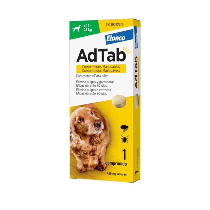 Adtab 450 mg para perros de 11 a 22 kg proporciona una protección eficaz contra pulgas y garrapatas durante un mes. De acción inmediata, además, con sabor agradable para su facilidad de ingestión.