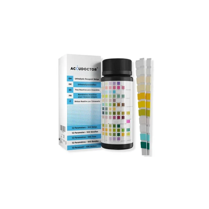 Tiras de orina Accudoctor 12 parámetros, 100 unidades. Ayuda a monitorizar la salud de forma rápida y sencilla. Permite detectar diferentes sustancias en la orina: leucocitos, urobilinógeno, proteínas, bilirrubina, glucosa, ácido ascórbico, gravedad específica, cetonas, nitrito, creatinina, pH y sangre. ¡Cuida de ti y los tuyos!