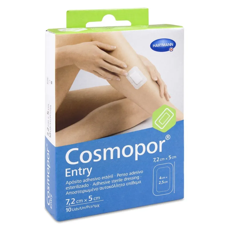 Cosmopor Entry está disponible en paquetes de 10 unidades. Cada apósito viene sellado individualmente para garantizar su esterilidad y calidad hasta el momento de su uso.