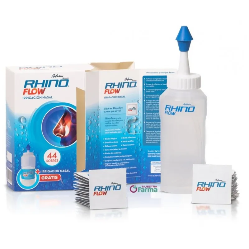 Rhinoflow Estuche+Irrigador Nasal es un producto diseñado para ayudar en la limpieza y descongestión de las fosas nasales. Contiene 44 sobres de 3 gramos y una botella de 300 ml para facilitar la irrigación nasal.