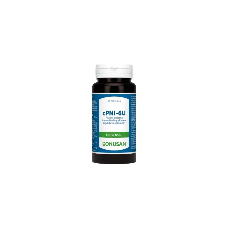 Bonusan cPNI - 6U 60 cápsulas es un complemento alimenticio diseñado para conjugar ingredientes que contribuyen al mantenimiento de unas defensas naturales equilibradas y al bienestar psicológico. Forma parte de la línea de Psiconeuroinmunología clínica (PNI) y contiene extractos estandarizados de Hypericum perforatum, Griffonia simplicifolia, Berberis vulgaris y Crocus sativus que pueden intervenir en procesos de regulación del ánimo y en el soporte de la respuesta inmunitaria.