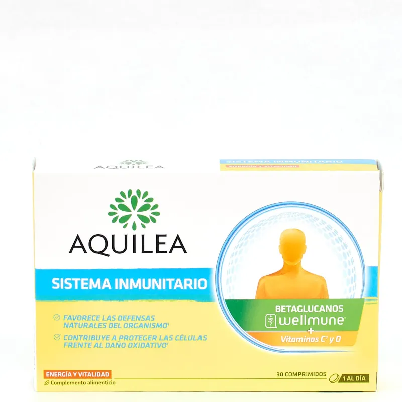 Aquilea Sistema Inmunitario, 30 Comprimidos es un complemento alimenticio que aporta Wellmune, un β-glucano natural patentado, junto a vitaminas C y D. Estos ingredientes han sido seleccionados para contribuir al normal funcionamiento del sistema inmunitario, según la normativa vigente, y apoyar la actividad y vitalidad celular diaria. Su formulación está avalada por estándares de calidad que garantizan el origen, la pureza y la estabilidad de sus nutrientes activos.