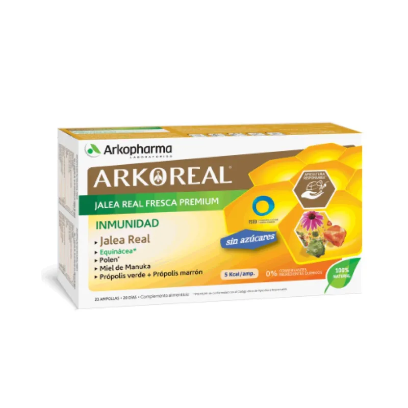 Arkoreal Jalea Real inmunidad sin azúcar es un complemento alimenticio en ampollas que contiene jalea real, propóleo, miel, polen y un aporte de vitaminas B3, B5, B6, C y fósforo. Es una formulación apta para adultos y a partir de 12 años, diseñada para complementar la dieta diaria con nutrientes de origen apícola y micronutrientes esenciales. Al no incluir azúcares añadidos, ofrece una alternativa apta para quienes buscan controlar su ingesta calórica y evitar variaciones bruscas de glucosa.