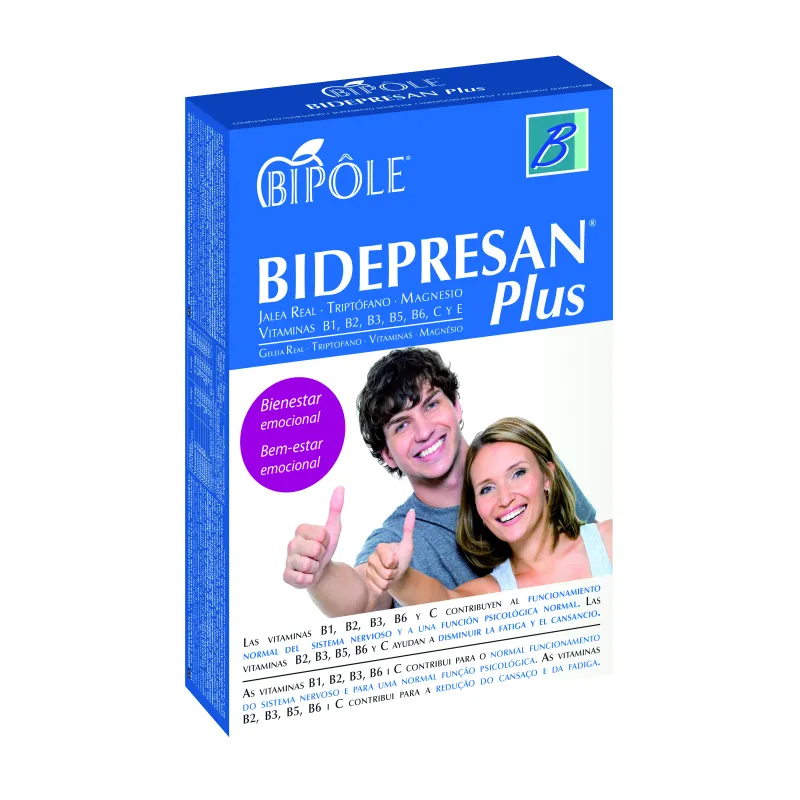 Bipole Bidepresan es un complemento alimenticio formulado con extractos de jalea real, hipérico (Hypericum perforatum), vitaminas del grupo B y C, magnesio y triptófano, seleccionado por sus funciones fisiológicas en el sistema nervioso y en el metabolismo energético. Su composición proporciona nutrientes que participan en el funcionamiento normal del sistema nervioso y en los procesos que favorecen la estabilidad emocional, contribuyendo a mantener una sensación de bienestar en épocas de fatiga o estrés.