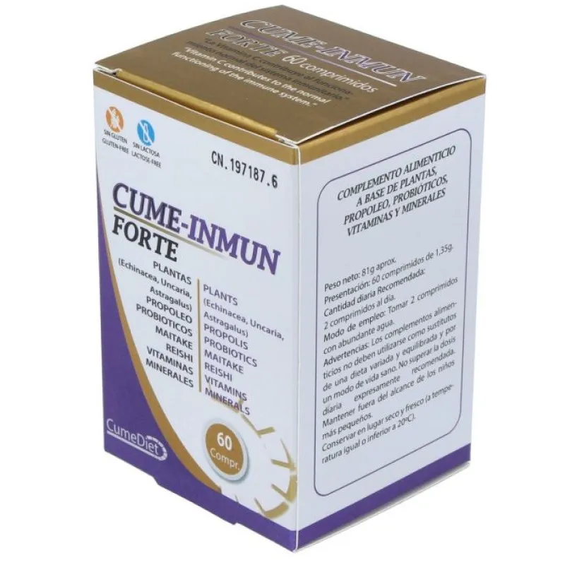 Cumediet Cume-Inmun Forte 60 comp. es un complemento alimenticio que integra un conjunto de vitaminas, minerales y extractos vegetales pensado para contribuir al funcionamiento normal del sistema inmunológico. Cada envase contiene 60 comprimidos que aportan una formulación diaria adecuada para cubrir las necesidades de defensa en personas con estilos de vida exigentes.