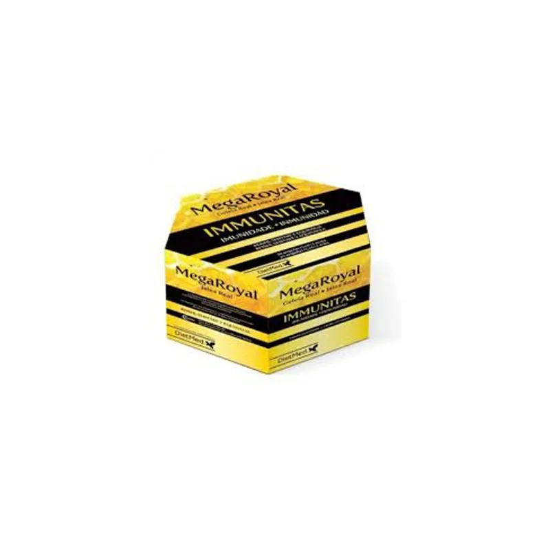 Megaroyal Immunitas es un complemento alimenticio en presentación de ampollas que aporta Jalea Real pura, un producto natural elaborado por las abejas obreras. La Jalea Real contiene un conjunto de nutrientes como vitaminas del complejo B, aminoácidos esenciales, ácidos grasos y minerales que contribuyen al mantenimiento de la vitalidad y al bienestar general del organismo.