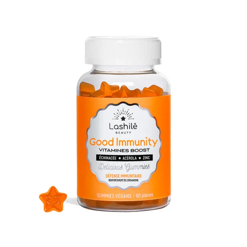 Lashile Beauty good inmunity defensas inmunitarias es un complemento alimenticio en formato de gominolas que combina activos de origen vegetal y nutrientes esenciales según la normativa vigente. Cada gominola aporta una formulación 100% vegana con un sabor agradable a naranja y sin conservantes artificiales. Su diseño facilita la integración en la rutina diaria como parte de una dieta equilibrada y un estilo de vida saludable, sin atribuir propiedades terapéuticas directas al producto.