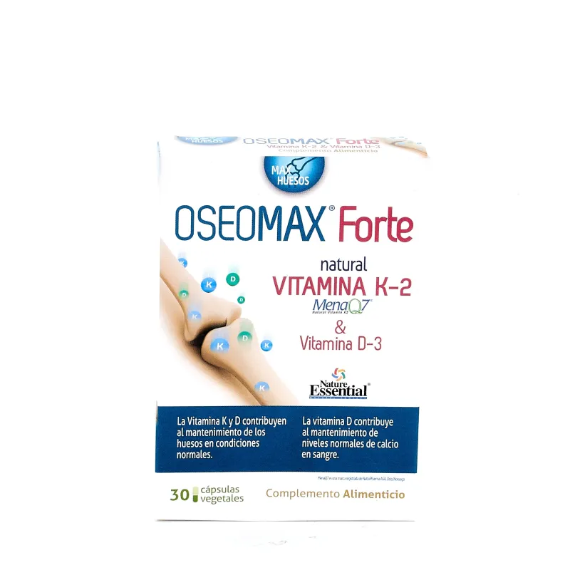 Nature Essential Oseomax Forte vitamina K-2+ vitamina D3 es un complemento alimenticio formulado con vitamina K2 (menaquinona) y vitamina D3 (colecalciferol). Estos nutrientes han sido seleccionados por su implicación en el metabolismo del calcio y el mantenimiento de la salud ósea. Cada cápsula aporta una concentración estándar de ambos compuestos para facilitar su incorporación en la dieta diaria. La vitamina D3 interviene en la absorción de calcio y fósforo, mientras que la vitamina K2 participa en la activación de proteínas responsables de dirigir el calcio hacia el tejido óseo.