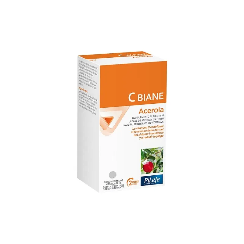 Pileje C Biane acerola es un complemento alimenticio en comprimidos masticables formulado con extracto de acerola, fuente de vitamina C natural. Sus ingredientes están pensados para contribuir al funcionamiento normal del sistema inmunitario, al metabolismo energético y a la protección de las células frente al estrés oxidativo.