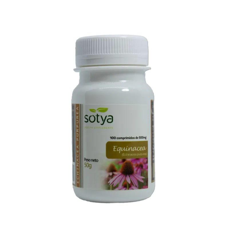 Sotya Equinacea es un complemento alimenticio en envase de 100 comprimidos de 500 mg cada uno, formulado con extracto seco de raíz de Echinacea purpurea y Echinacea angustifolia, combinado con raíz de achicoria, fosfato cálcico y antiaglomerantes. La equinácea se ha seleccionado por su contenido en polifenoles, alcamidas y otros fitoquímicos, que aportan nutrientes diseñados para contribuir al mantenimiento de las defensas naturales del organismo.