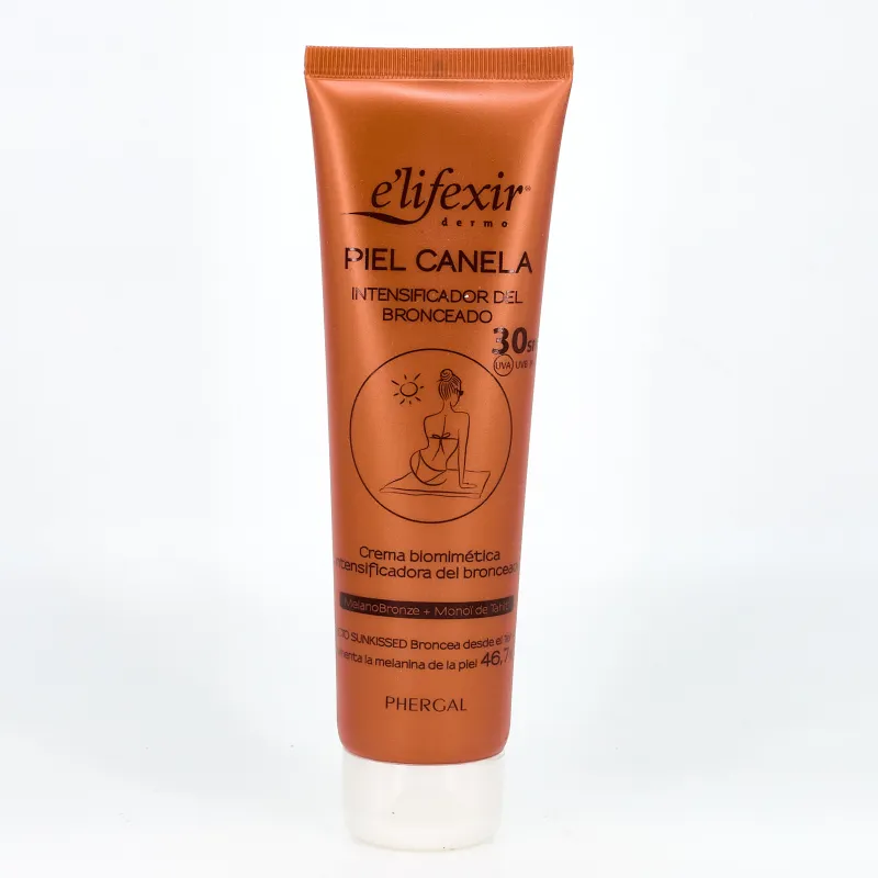 Elifexir Piel Canela Intensificador del Bronceado Corporal SPF 30 es una loción nutritiva a base de manteca de karité, creatinina y complejo activo Citrus Bioflavonoid Complex, que estimula la producción de melanina para intensificar el bronceado, mientras protege la piel de los daños solares.