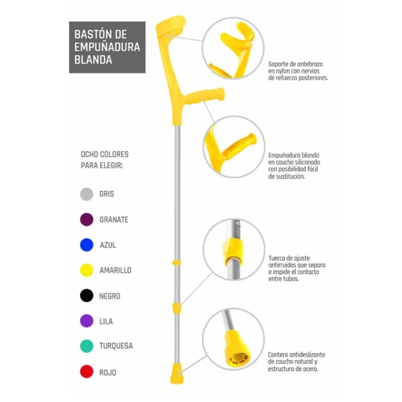 El Bastón inglés o muleta con empuñadura blanda, es un indispensable producto de ortopedia que se ha convertido en uno de los más demandados en Ortoibérica. Combinando una robustez ensayada con un diseño ligero, hace que esta muleta sea fácil de llevar, facilitando la movilidad, proporcionándote la confianza y seguridad que necesitas en cada paso.