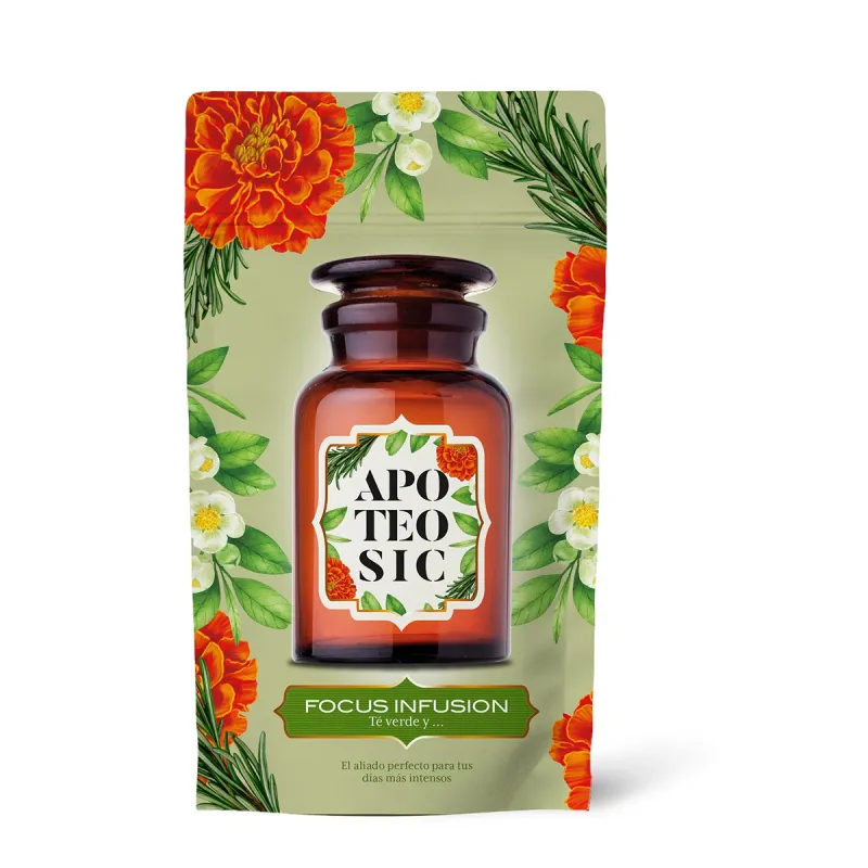 Apoteosic Focus Infusión Bolsa, 12 unidades es una combinación equilibrada de plantas aromáticas con un perfil organoléptico agradable y un aroma fresco. Cada bolsita contiene una selección de hojas de menta, flores de manzanilla, hojas de romero y extracto de ginkgo biloba, ingredientes tradicionales asociados a la atención y la sensación de alerta mental.