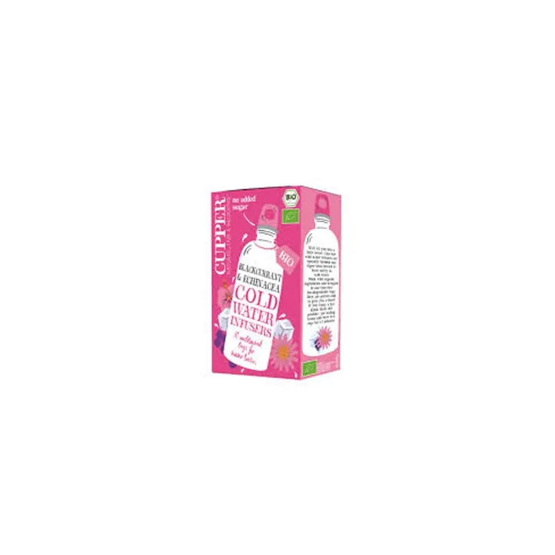 La Infusión Fría de Grosella Negra y Equinácea Bio de Cupper es una bebida refrescante elaborada con ingredientes 100% naturales, sin azúcares añadidos y apta para veganos.