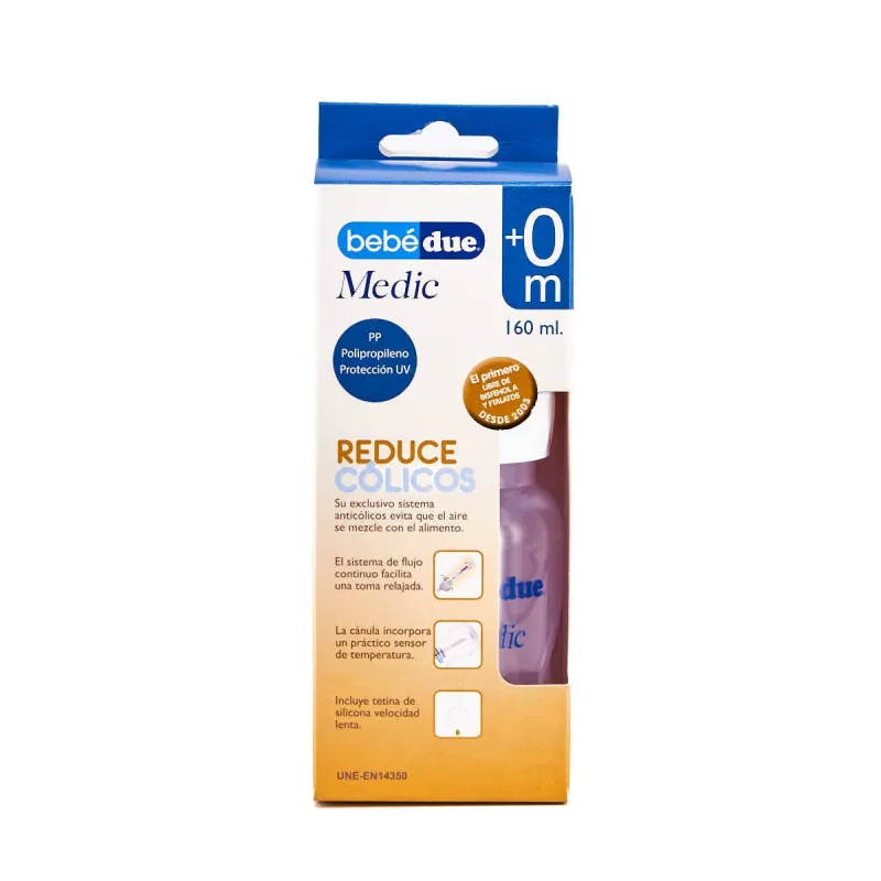 El Biberón BebéDue Médic está fabricado en polipropileno libre de BPA. Incluye sistema anticólicos, sensor de temperatura y sistema de flujo contínuo para una alimentación cómoda y segura.