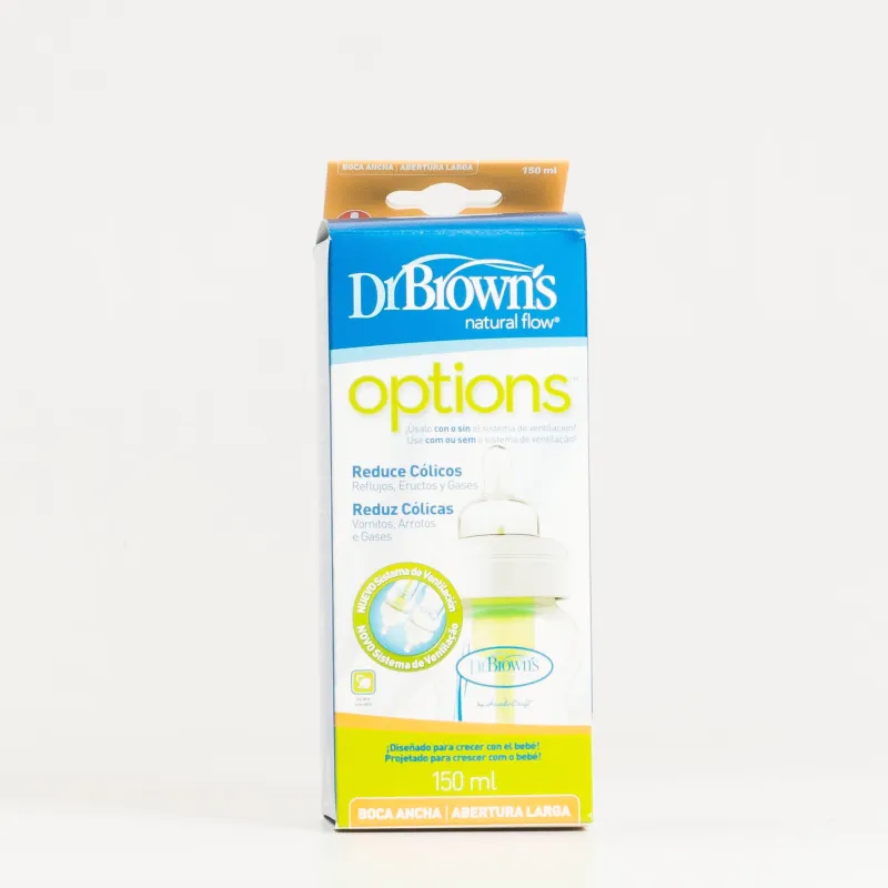 Biberón Dr. Brown´s boca ancha con tetina de silicona 150 ml. Con sistema de ventilación que reduce los colicos y mantiene las propiedades de los nutrientes.