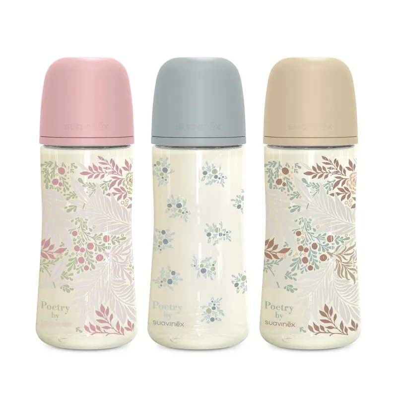 Suavinex Biberón Tetina Silicona Poetry L, 360 ml es un biberón diseñado para bebés a partir de 6 meses. Cuenta con una tetina fisiológica SX Pro de silicona de flujo denso (L), que imita la forma del pezón materno, favoreciendo una alimentación natural. Su diseño está pensado para respetar el desarrollo bucodental del bebé.