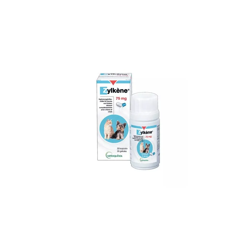 Zylkene 75 mg es un complemento alimenticio para perros y gatos que se presenta en forma de cápsula oral. Este producto está diseñado para ayudar a las mascotas en situaciones de cambio en su entorno, tales como la llegada de un nuevo miembro a la familia, periodos de soledad, lactancia, destete, viajes, fuegos artificiales o cualquier otra circunstancia que altere su rutina habitual.