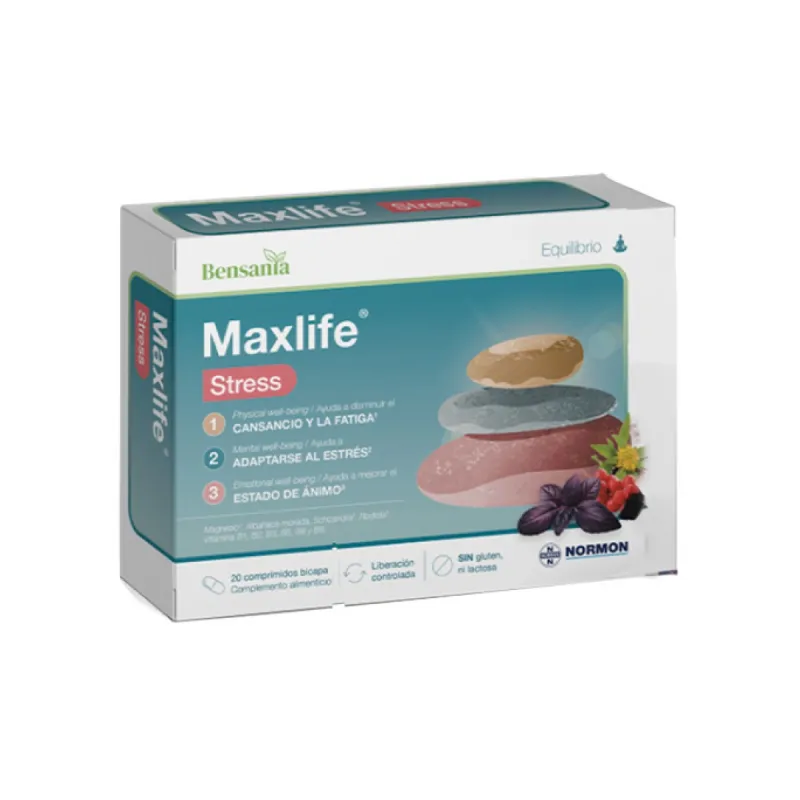 Bensania Maxlife Stress es un complemento alimenticio en comprimidos bicapa, diseñado para facilitar la liberación inmediata y sostenida de sus ingredientes. Incluye adaptógenos como albahaca morada, schizandra y rhodiola, combinados con magnesio y vitaminas del grupo B. Está dirigido a personas que buscan apoyar su resistencia al estrés, reducir la sensación de cansancio y mantener el bienestar emocional a lo largo de la jornada.