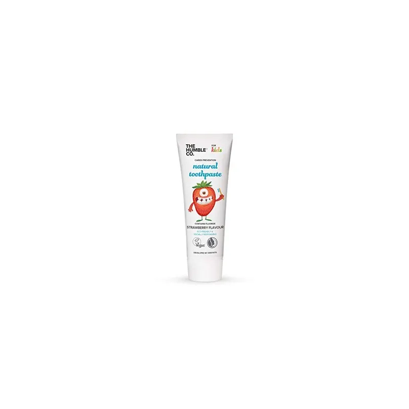 Dentífrico infantil sabor fresa The Humble, 75ml, con fórmula vegana y ecológica que limpia suavemente los dientes de los niños.