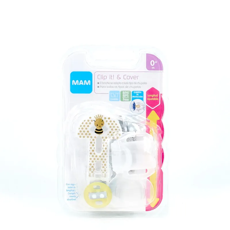 - Dispone de una anilla desmontable que se ajusta a todos los chupetes MAM y a cualquier tipo de escudos.