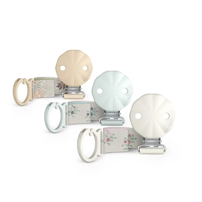 Broche con cinta de la colección Poetry de Suavinex, diseñado para sujetar el chupete a la ropita del bebé, evitando que caiga al suelo y se ensucie o pierda. Apto desde 0 meses.