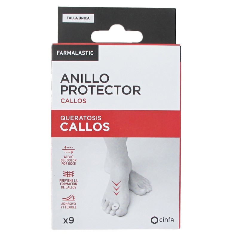 El Farmalastic Anillo Protector Callos es un dispositivo ortopédico diseñado para proteger y aliviar el dolor causado por los callos en los pies. Estos anillos están fabricados con materiales de alta calidad que proporcionan una amortiguación efectiva y comodidad al usuario. Vienen en una talla única, adecuada para diversos tamaños de calzado, y se presentan en un paquete de 9 unidades.