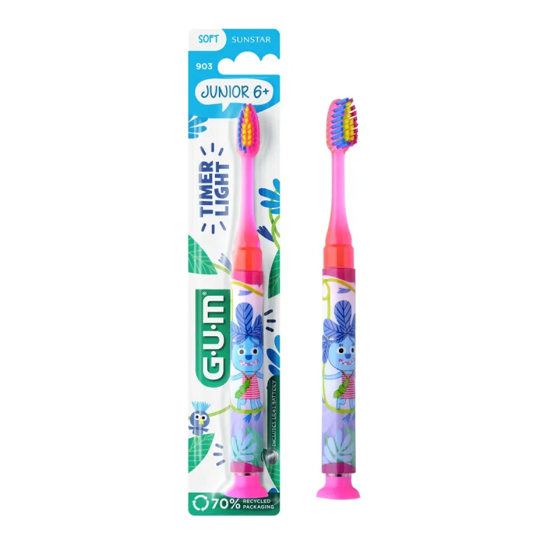 Cepillo infantil con luces intermitentes que marcan el tiempo de cepillado recomendado de 2 minutos. Presentado para niños de 6 años en adelante.