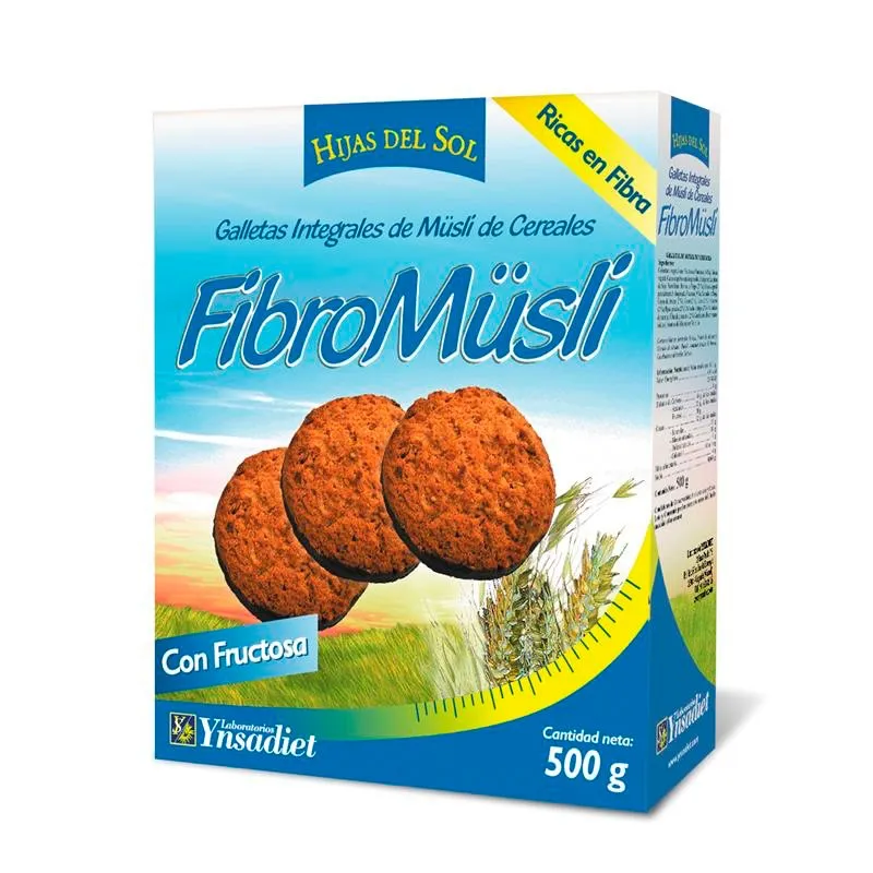 Ynsadiet Galletas Fibromuesli 500 g son un producto de repostería elaborado con copos de avena, muesli (mezcla de cereales, frutas deshidratadas y semillas), aceite de girasol y fibra (inulina). Se presentan como opción de desayuno o aperitivo entre horas dentro de una alimentación variada. La avena y los cereales integrales aportan carbohidratos de absorción lenta, mientras que las frutas deshidratadas incluídas en el muesli suministran azúcares naturales y micronutrientes. El aporte de fibra favorece completar la ingesta diaria recomendada de este nutriente.