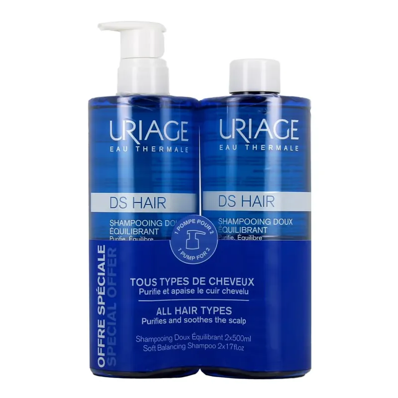 Se presenta en un pack que incluye dos envases de 500 ml cada uno del champú DS Hair de Uriage, diseñado para uso continuado.
