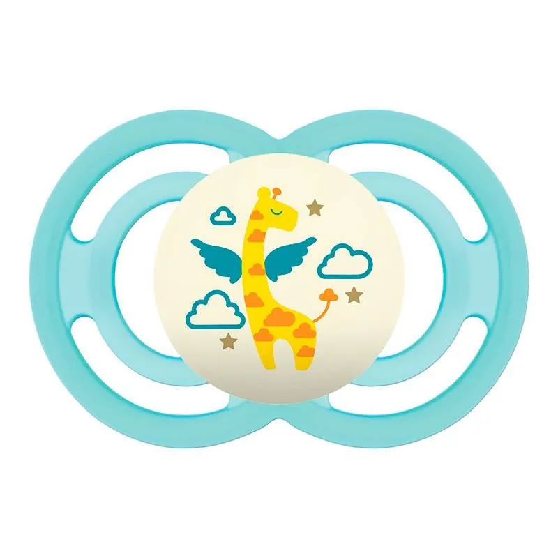 Este chupete de silicona ofrece varios beneficios. Suprime la necesidad de succión natural, contribuye a la reducción del riesgo de mala posición de dientes y mandíbula, y resulta muy confortable para los niños gracias a su collarín extrafino y su textura agradable. Además, su innovadora función de brillo en la oscuridad ayuda a tu hijo a encontrarlo fácilmente durante la noche sin despertarlo totalmente.