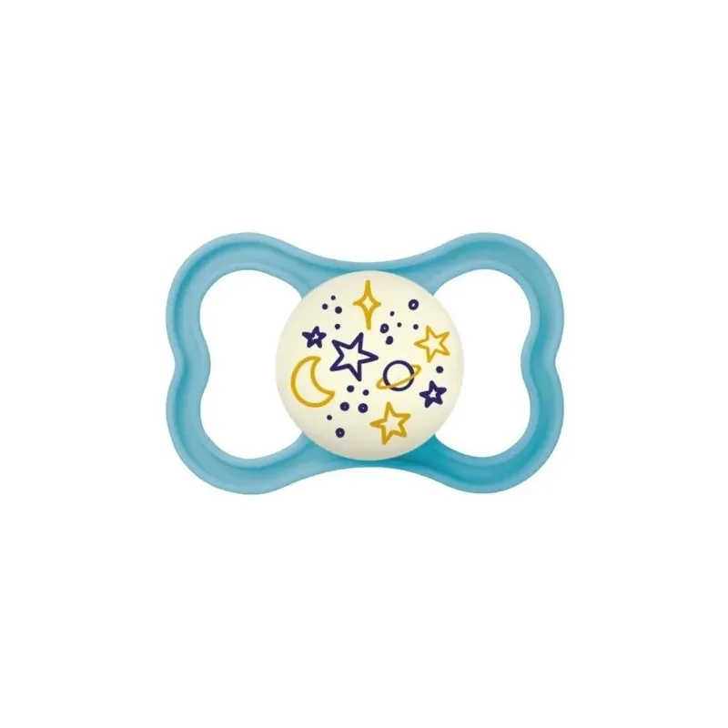 - Cuenta con un botón luminiscente estampado de planetas que ayuda a encontrar el chupete fácilmente en la oscuridad.