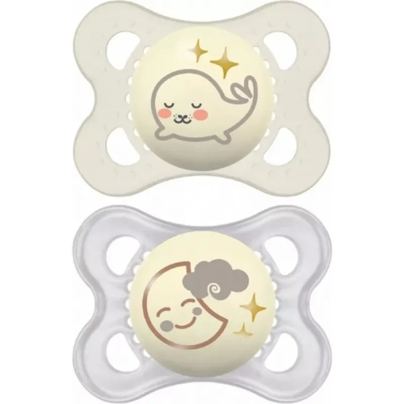 MAM Chupete Silicona Simetrica Original Night Neutro +0M son chupetes diseñados especialmente para recién nacidos, que no solo cumplen con la función de satisfacer el reflejo de succión, sino que también cuentan con la particularidad de brillar en la oscuridad, facilitando su localización durante la noche.